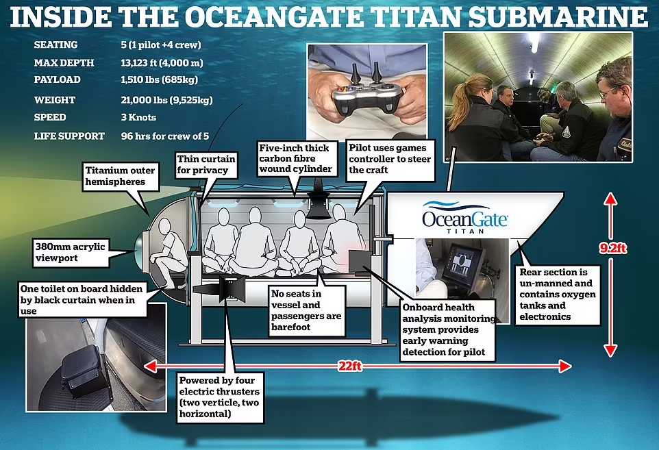 One of the distinctive features of this "Titan" deep diving submarine is (or was) the use of carbon fiber and composite materials for the pressure hull. It wasn't entirely made of these kinds of materials. These materials were combined with titanium to construct the pressure hull. This "hybrid" pressure hull construction enabled a lighter weight submarine, which is advantageous.