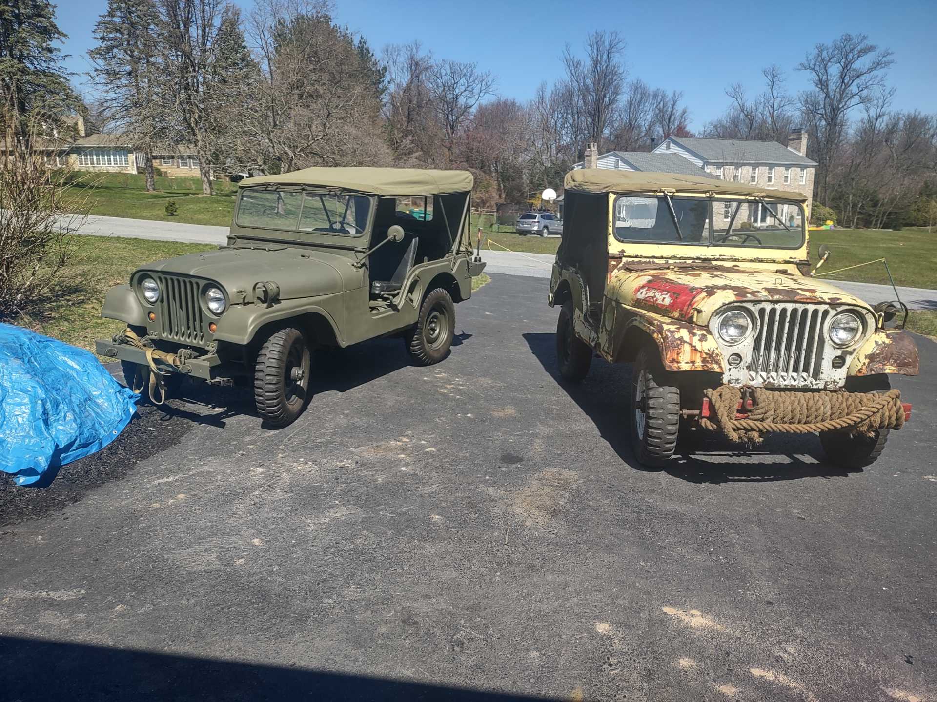Here is a pic from last week. They are both essentially stock... The OD one has been modernized a little with turn signals and more visible tail light lenses. The yellow one is crusty and dusty but 100% fully functional. I am just to the point of getting it back on the road. After the Army the yellow one was used by the forest service in North Carolina. The one that is OD should actually be blue, from what I see it was a radio jeep with the Navy and should be blue. Yesterday was spending time working out the good ol' vacuum wiper motors. I will add that these are more modern that you think...they are keyless entry, keyless ignition and push button start ( foot push button starter)!
