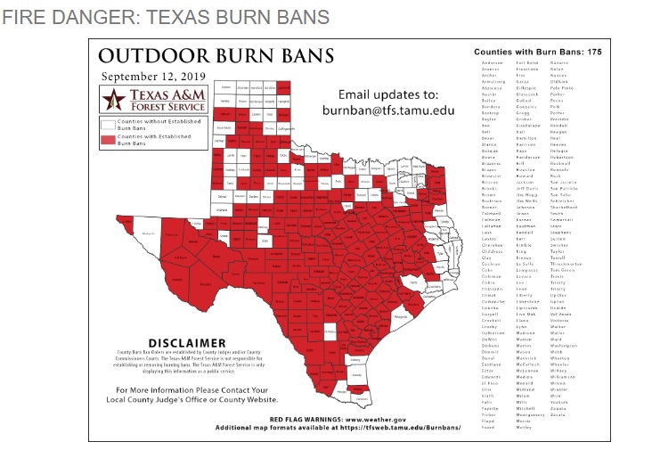 After the wettest June and July I remember, it has finally gotten hot and dry and pastures brown and crinkling underfoot. Of 254 counties in Texas, as of today, there are 172 counties under full burn bans, mine and the counties surrounding me included. Not supposed to even BBQ outside, but most still do. Absolutely NO open fires tho, even in a burn barrel for household trash. Will probably increase next week, as some of the counties not under burn ban are in extreme South and West Texas as well as extreme East Texas counties (farther East than I am)