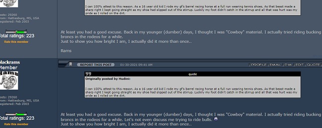 | quote | Originally posted by blackrams: At least you had a good excuse. Back in my younger (dumber) days, I thought I was "Cowboy" material. I actually tried riding bucking broncs in the rodeos for a while. Just to show you how bright I am, I actually did it more than once..