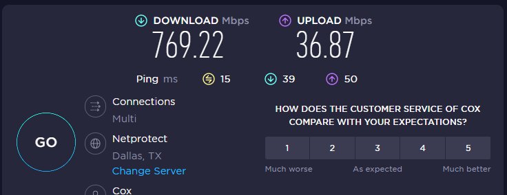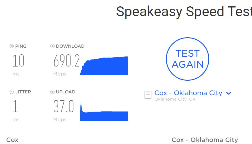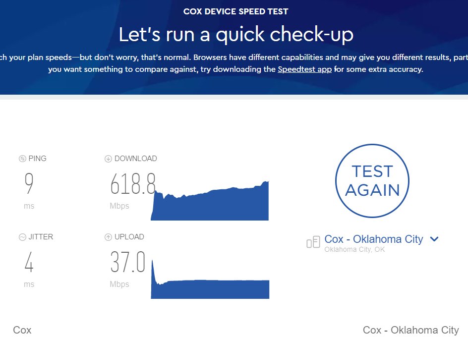 Cox internet giga-blast plan $114.99/month, Yukon, OK 5:25pm Friday afternoon. Test done with VPN turned off. Drops to ~200Mbps with VPN turned on. It's funny, Cox claims "speeds up to 1Gbps" download. Never have gotten over 920Mbps and average around 600Mbps, I asked a technician once: "So it can be anywhere between 0 and 1Gbs?" and they said "Yes." Heaven forbid it ever go past the 1Gbps!