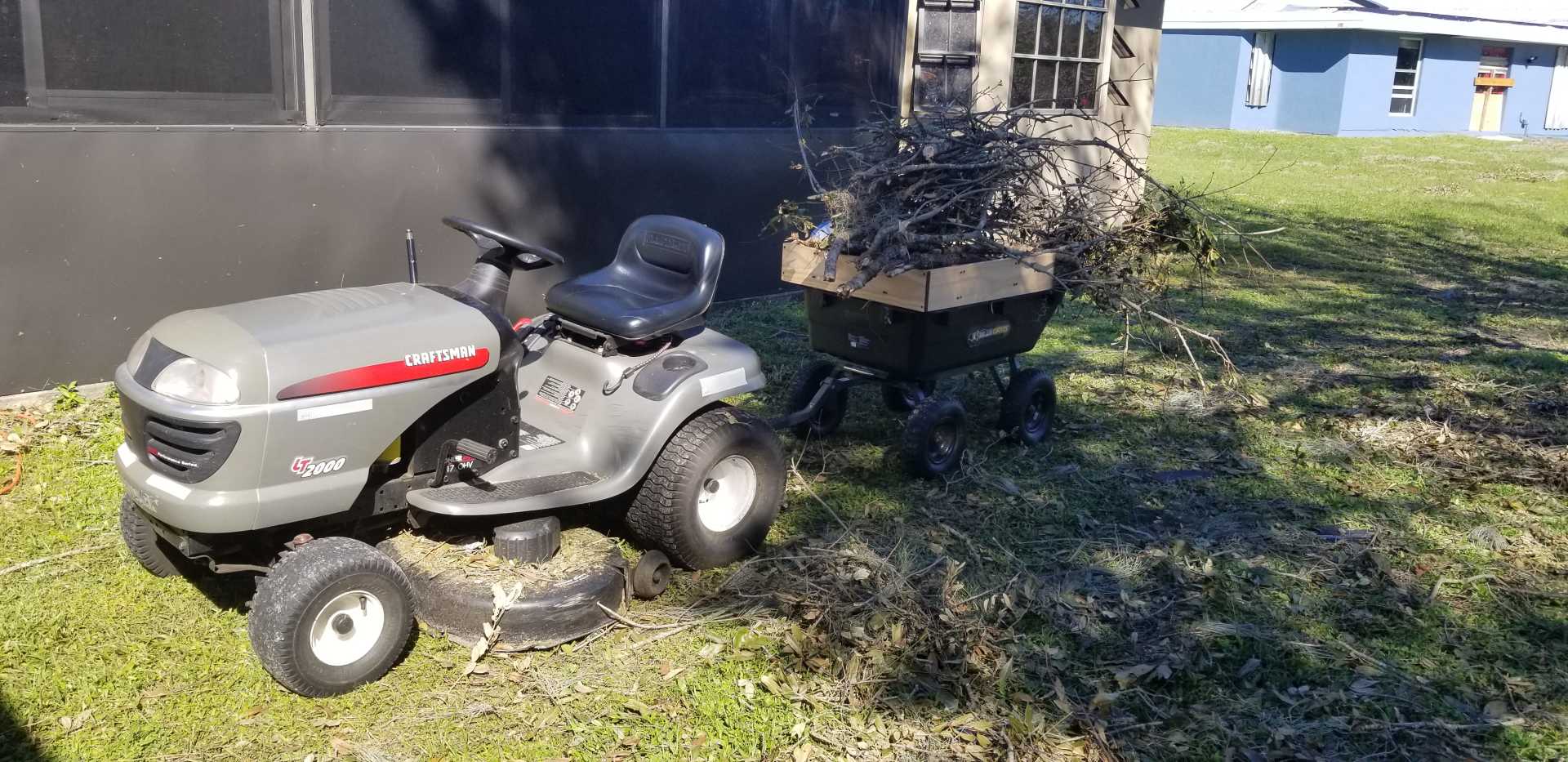 The mower helpped in moving hugh tree limbs that I could not move by hand and also towing small trailer to move all the muck that was blown into the yard.