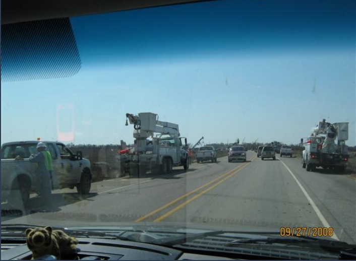 1 week after Hurricane Ike came thru. These guys were from Joplin Mo. The photo doesn't do justice to the number of trucks on this stretch of road, that runs thru a marsh between Winnie Tx and High Island Tx.