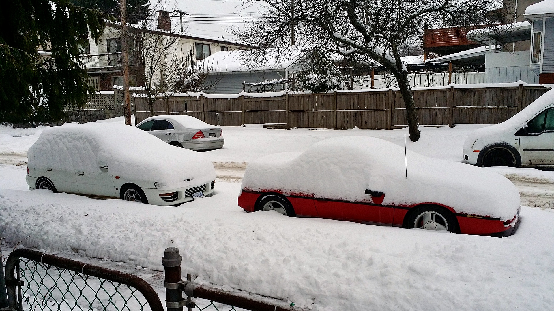 After I shoveled all my sidewalks today (corner lot!), I took a quick shot of my Formula and Subie sitting on the side-street feeling sorry for themselves. The warming trend has now started though. As of 5 PM local time, it's 2°C/36°F.
