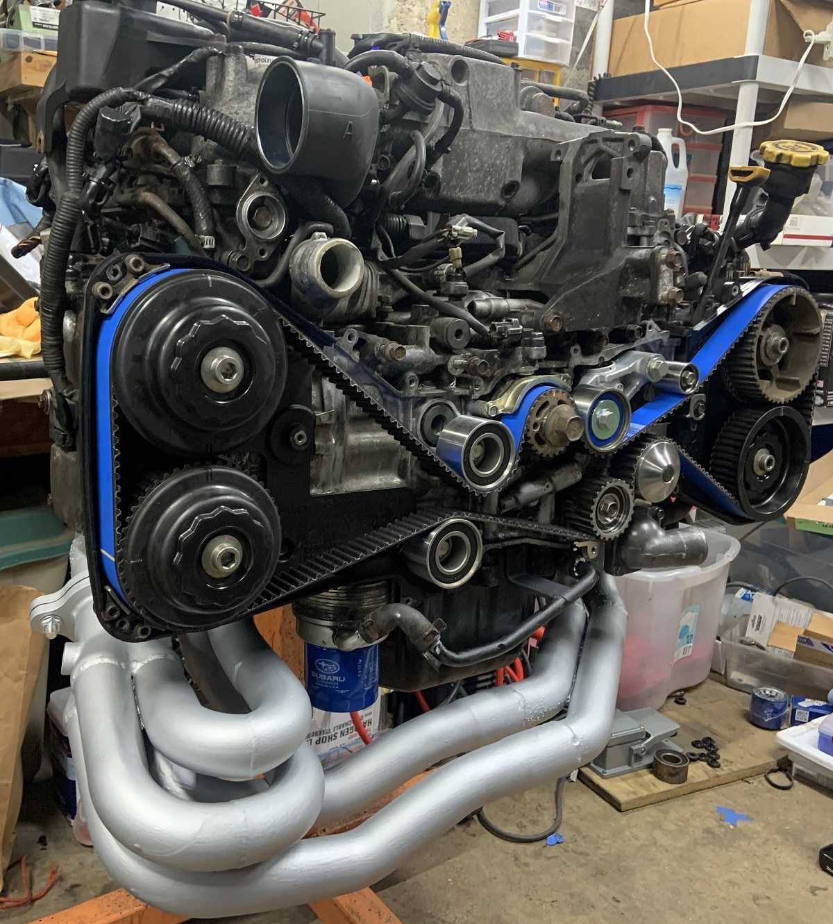 It still has the factory STi exhaust system (un-equal) from the heads to the far end of the turbo downpipe. The aftermarket free-flow exhaust is from that point back. I understand about equal length headers improving the engine's breathe-ability... but I really enjoy the Subie rumble, and didn't wish to sacrifice that lovely sound.  [This message has been edited by Patrick (edited 12-16-2022).]