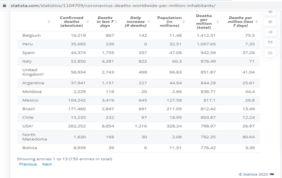I don't disagree with Maryjane's comparison based on the 270,000 number but I do want to toss in some data the way I think Covid19 deaths should be discussed, namely, as Deaths per Million. Here is a screen shot of a table on Statista.com, a subscription service (but if you are interested you can see all 150 country's data on there for free.) My point is that the USA is currently pushing 11th place on the list. The safest place to be is Burundi, with only 1 Covid19 death and the worst place to be is Belgium. Unfortunately, night-after-night all we ever get shown on the news programs are the absolute deaths which make the USA look to be the worst place to be.