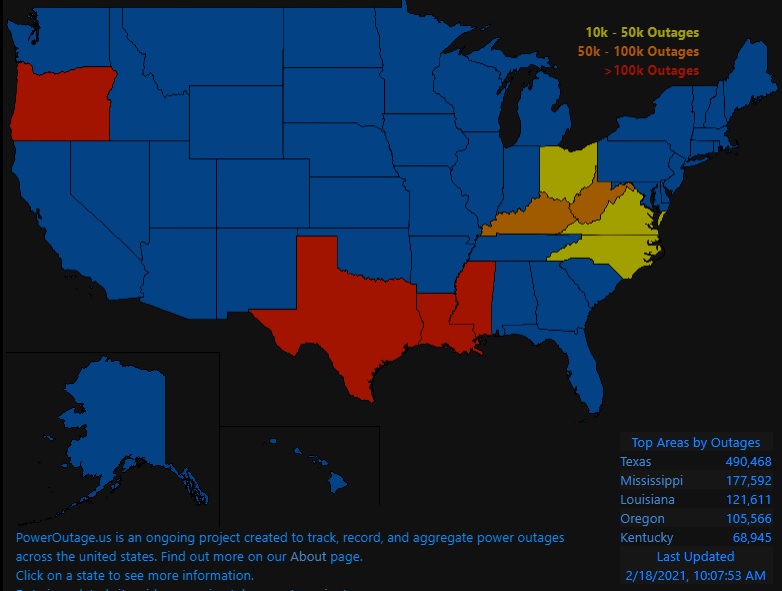 Considering the size of Texas, it's population, # of business and residential customer power requirements, we aren't doing as bad as Ron would have people think. Our residential customer base power needs exceeds the totals of all other states experiencing outages this morning, as does the miles of power lines, and evidently, the availability of those other states to buy power from other parts of their grid consortium isn't exactly bulletproof either. And of course, Mississippi is still our (and everyone else's) Mississippi.