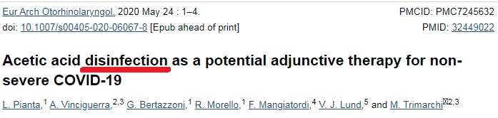 SARS-CoV-2 is a new pandemic influenza caused by a coronavirus which main route of transmission is through exhaled droplets that primarily infect the nose and the nasopharynx. The aim of this paper is to evaluate the effect of acetic acid, the active component of vinegar, as a potential disinfectant agent for upper airways.[This message has been edited by randye (edited 12-23-2021).]