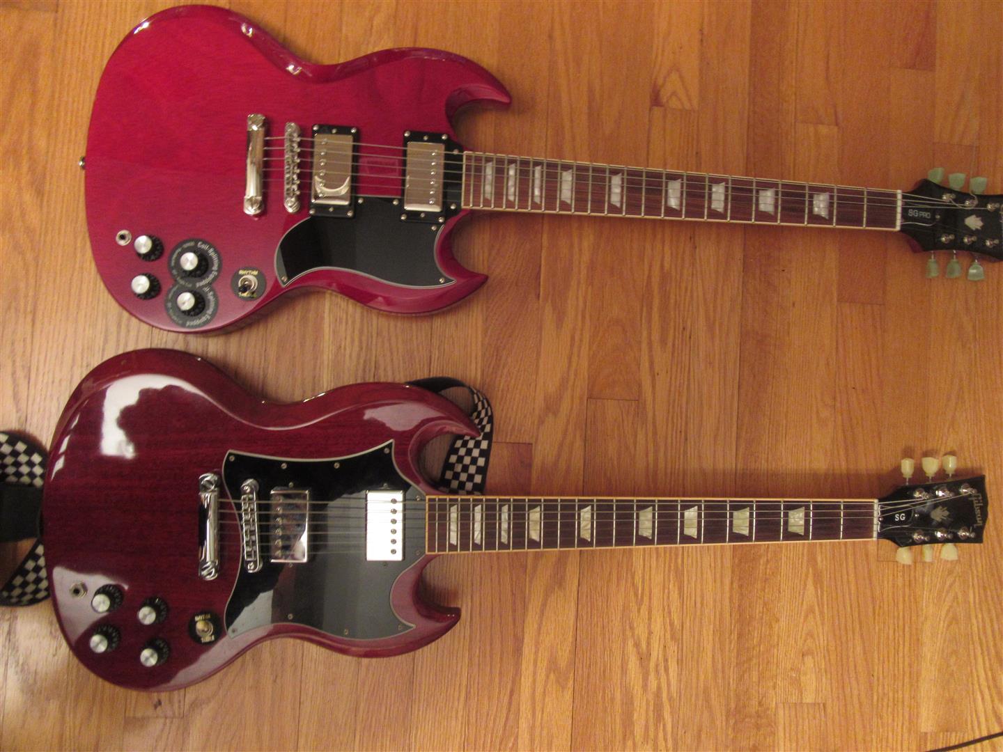 Found an Epiphone SG G-400 PRO, which just means it's got a set neck, coil taps on both pickups, alnico magnets in the pickups, Wilkinson machineheads to mimic Gibsons and the same trapezoid fretboad inlays like a Gibson. It's in mint condition.