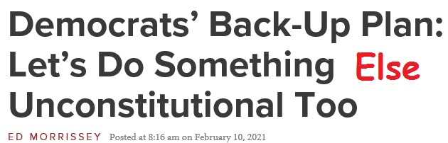 "Despite the obvious unconstitutionality of the plan, McClatchy reports that Democrats still want to keep the so-called 14th Amendment Option in reserve in the all-too-certain case that the impeachment trial results in an acquittal for Donald Trump. Democrats want to "defend the Constitution" by violating one of its core controls on congressional power, it seems"[This message has been edited by randye (edited 02-13-2021).]