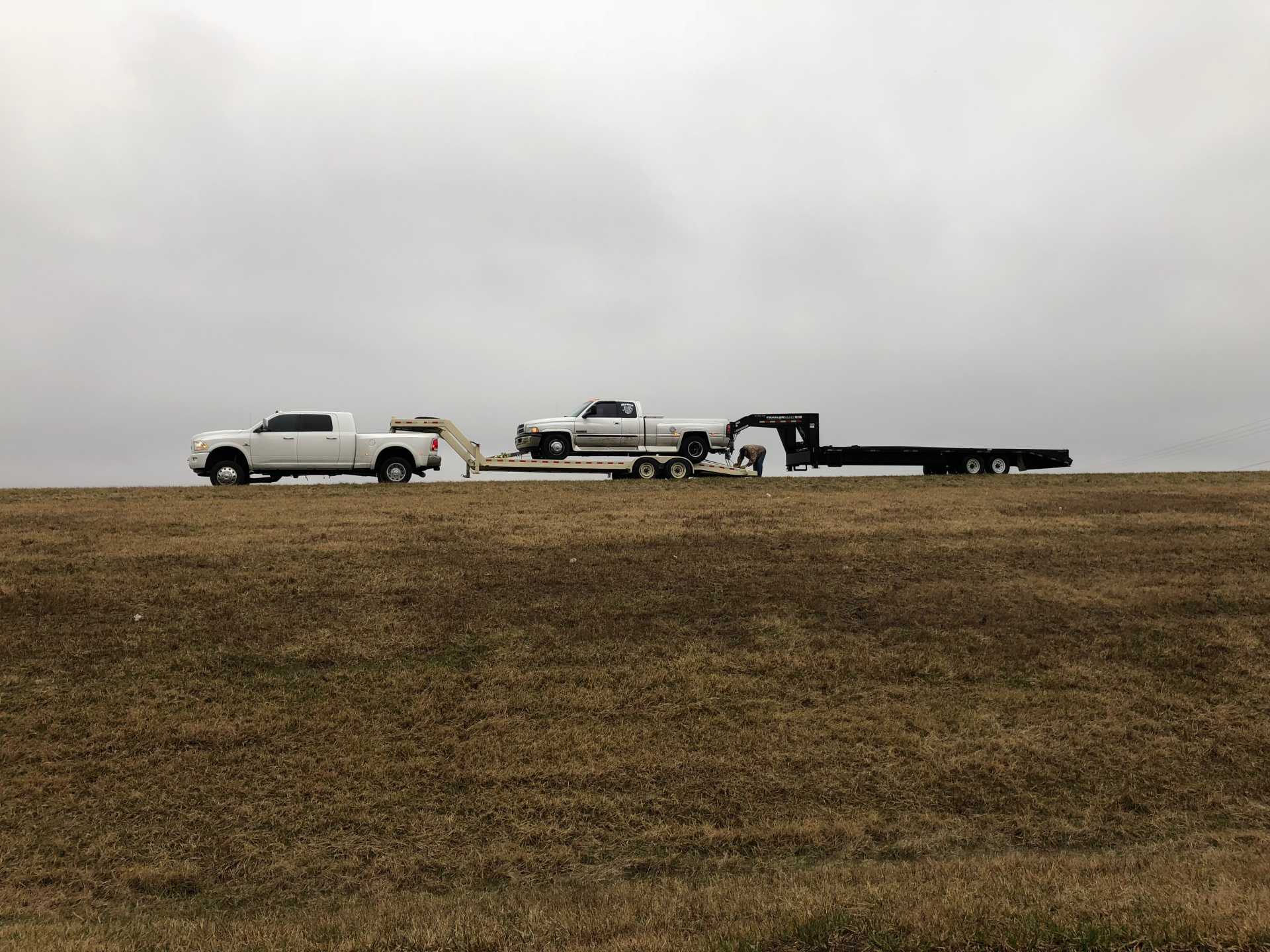 Due to the bad fuel, we had to load up the Dodge shown on the trailer but, knowing the ass end of the second trailer would be dragging if we coupled to the in bed hitch, I used the factory installed class five hitch with a 2 5/16th ball and pulled the rig home that way. 650 miles from home, 93 feet long, tandem trailers. We sure got a lot of looks. Figured we would get pulled over for doing it but, got passed by 7 different LEOs and passed by several different weigh stations with State DOT folks watching us and nothing was said.