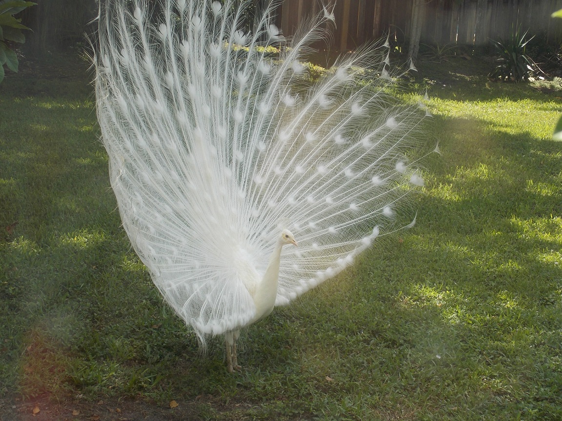 And then we had a Peacock that lived in my backyard. He would walk around the cul-de-sac and we'd feed him nuts, and then he'd go to sleep (like clockwork) every night in the huge live oak tree that was in my backyard. Most of the day though, he would basically hang out in my backyard doing his Liberache thing with his feathers...