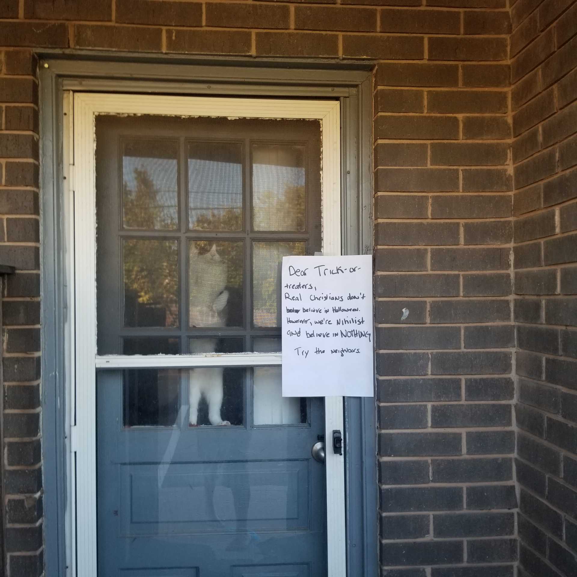 Dear trick or treaters, Real Christians don't believe in Halloween. However we're nihilist and believe in nothing. Try the neighbors.