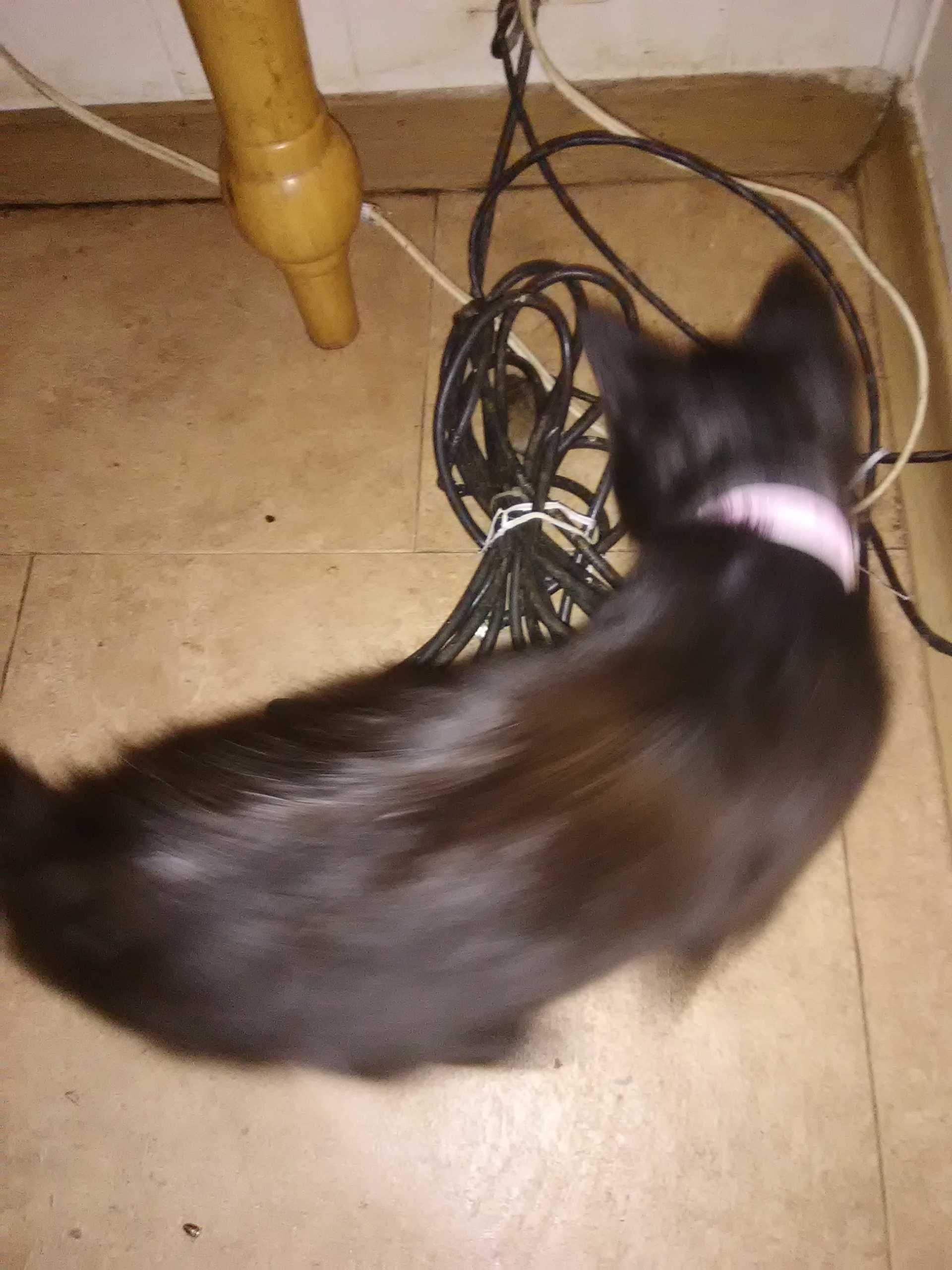 That was 5 minutes ago. The little mouse is hiding inside the tangle of cable wire...no WAY in hell the cat is going to get to him. . The cat is standing guard and pawing at the bundle of cable...no WAY in hell the mouse is fast enough to get away.