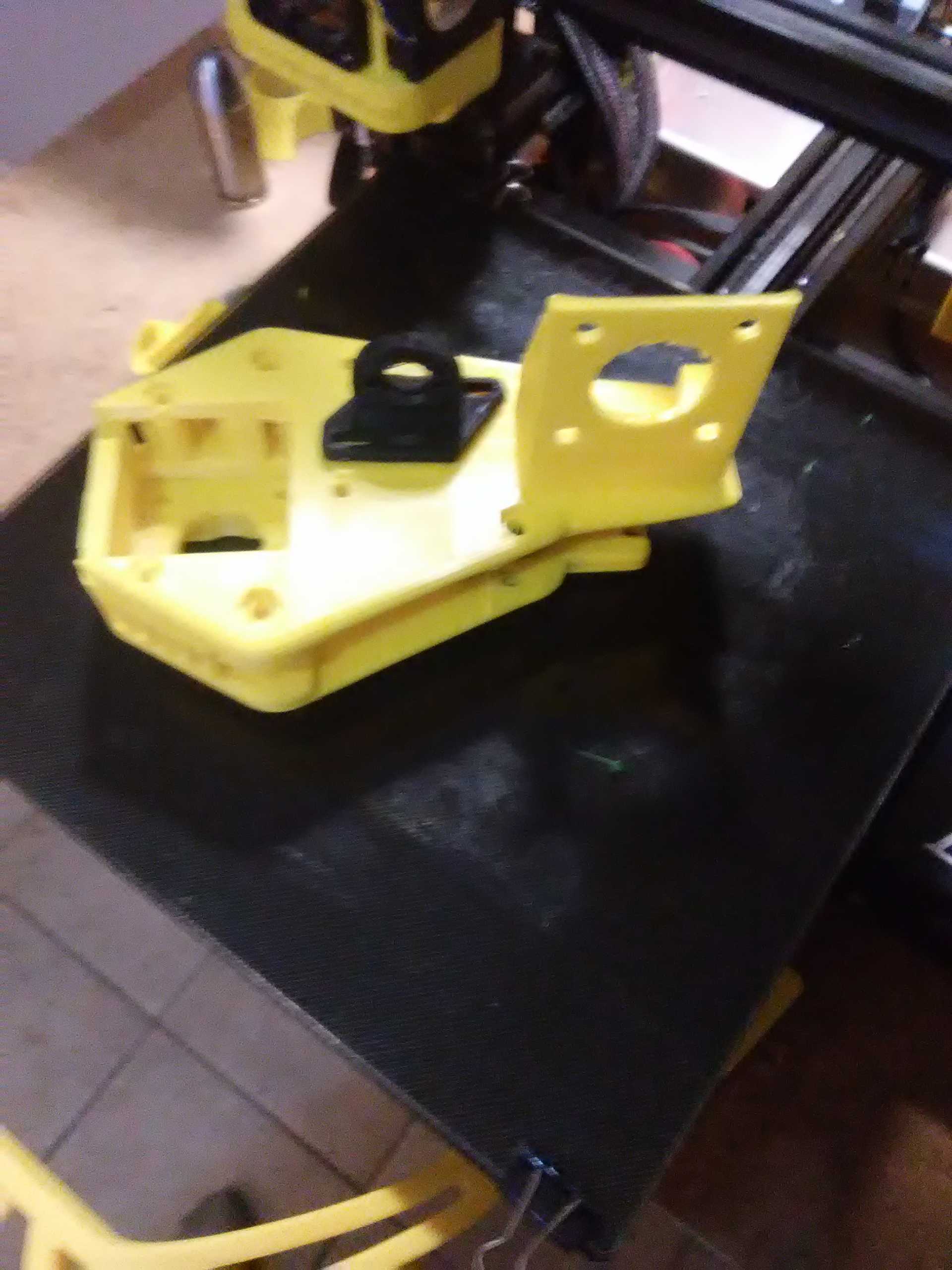 I did a re-mix to add a bracket on the back so I can keep the bowden extruder. Next time I'll go a little higher, this only gives about 2mm bed clearance under a 42-40 stepper, so I had to go to low-profile bed clips (still cheaper than re-printing or getting a pancake). I've got a direct-drive kit kicking around somewhere and used them before, but I find a short bowden is easier for on-the-fly changes, and the way I have the extruder moved right the bowden is very short, only about 6-8 inches or so.