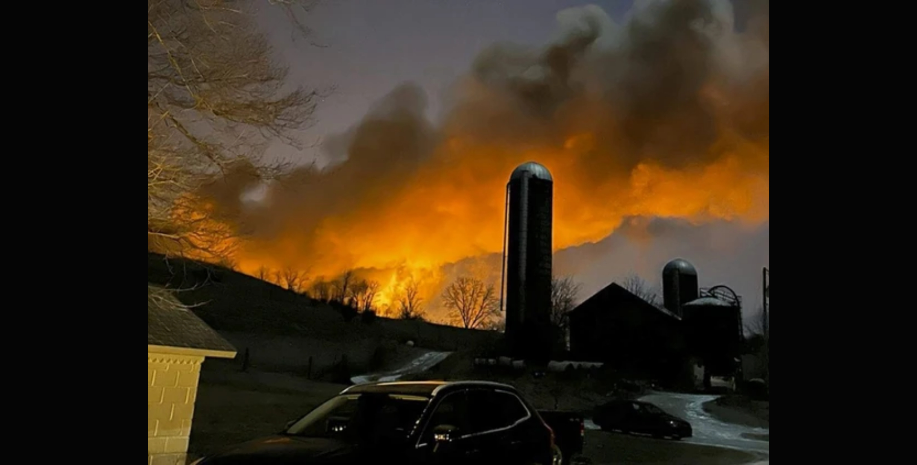 The Mississauga Train Derailment '79. The anhydrous chlorine tanker explosion would have created a phosgene gas cloud, like those used in WW1 trenches. So, like, it happened before. .. This is where the train caught fire. The photo above shows the tracks curving to the right, away from the telephoto camera, more than a mile east of the propane tanks on fire. On the right, you can see the water being pumped onto the chlorine tanker from the north, the prevailing winds to the south east.