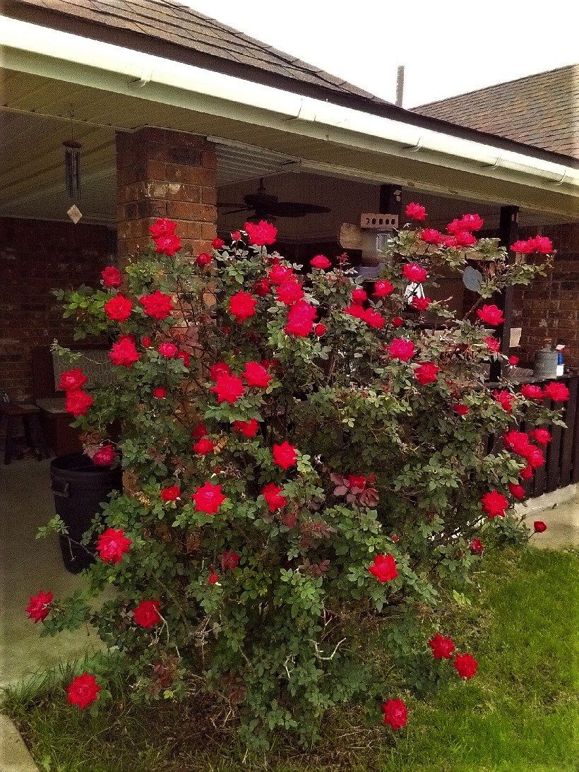 60 miles from the geographical center of Texas, Green grass (I've already mowed twice and need to again) and red blooms picture taken an hour ago