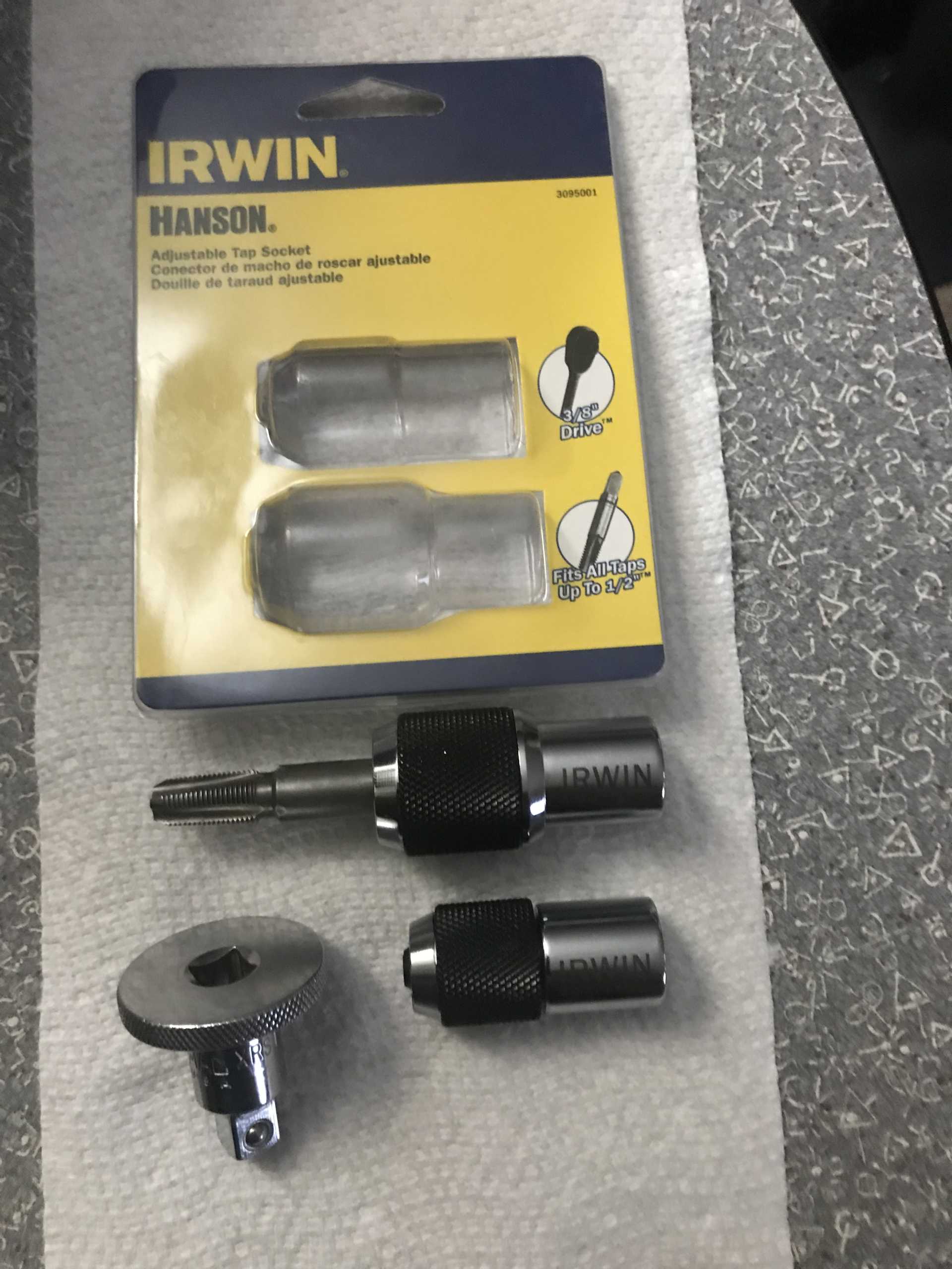 The upper two items are adjustable tap sockets from Irwin. They are great to have when you are trying to tap something in a tight place. (I already have a tap&die set but it has that typical T handle design and is not do-able for recessed hole reaming/chasing/threading. I just used this one this morning to chase some threads on my aluminum intake manifold on my Toyota 22re.