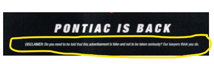 In https://www.youtube.com/watch?v=8FVBKs7cDGY an ad in the back of Car and Driver magazine (May 2024) an ad says Pontiac is "back." No its not april fools, The guy in the video seems to think Pontiac may actually be coming back in some form.