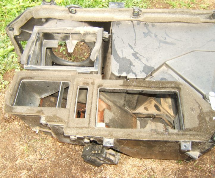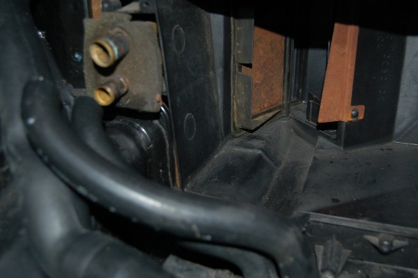 Two 7mm screws hold in a small bracket on the left side of the core. Once this is removed, the heater core comes right out. Be careful no to spill the remaining coolant inside the core on the carpet.