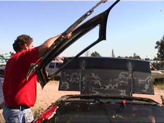 Use a long thin knife or wire to remove goo seal that runs across the top of the roof just above the windshield (about 2" back from the glass) (yes it can be a big pain to remove this stuff)