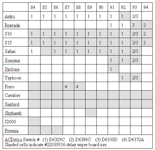 Here is a list of GM vehicles that use the same delay wiper board as the Fiero (shaded blocks). The numbers (1-4) indicate switches that while not identical, will work on the Fiero. There may also be others.