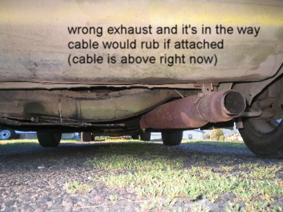 I see now what you were saying about the exhaust. I would recommend that you replace the exhaust with a stock configuration as I don't see any way of using your newly purchased cables with the exhaust pipe routed that way.