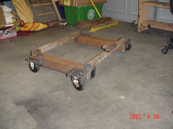 I use a shipping skid with some 4" wheels I got from Harbor Freight on sale. Works really well and is cheap, costing only for the wheels. The important thing to look for when interviewing pallets is a 4x4" block of hardwood in the corners, as these are the strongest. I drove around industrial areas and found mine in the trash. In LA there are lots of people who cruse for free skids to recycle. You see flat bed trucks piled way over the cabs with pallets. They get a coupla bucks a skid. I asked the company if I could have the one I got, they seemed to wish I would take all of them. You have to take out the center boards so that your floor jack will go through, and make sure that it will slide under the pallet.