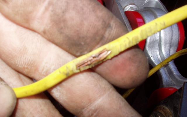 Well this car has been haunted with electrical problems for some time. The issues range from not starting at all, to running funky, and sometimes running fine. Well today we got a nice day, about 70 with sun, so we decided to disassemble the harness. Using a multimeter going through the wires, we found that one of the starter wires was grounding out. The whole loom was stripped off, and I began to search along the wires. This is what I found:
