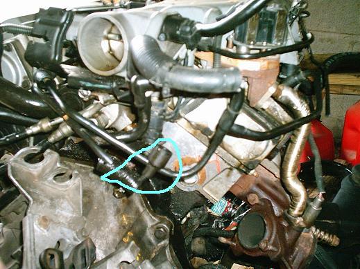 Connector is for coolant sensor. There are two, one goes to ECM, one goes to temp gauge. Cannot recall which this one is. Pipe goes undr plenum and connects to vacuum connector up by the other end of plenum (neear where fiero dogbone would go). This end goes to the tranny. It's called the 'transmission modulator' in the books. I think it stops the tranny shiffting so soon under hard accel (hi vacuum).