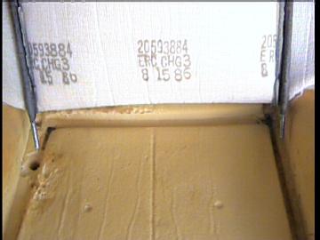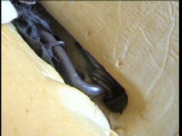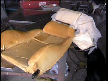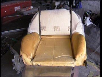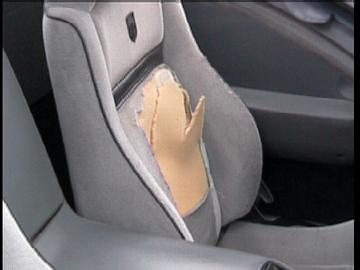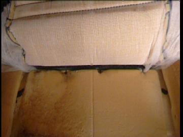 My damaged seat...after a dear friend decided to "just sit behind the wheel to see..." He had one of those belts on, with riveted-on chrome designs.Of course, he put his bum against the seat back, and just slid down!!! "What was that noise ?" he said "Sounded like somebody f*rted!!" I nearly did when he got out again and saw this!!!