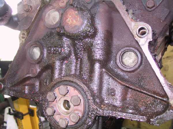 Well, since no one posted a pic I'll do it. Here's a typical cam cover plate leaker. Like stated, the cover plate is the one with three bolts above the crank.