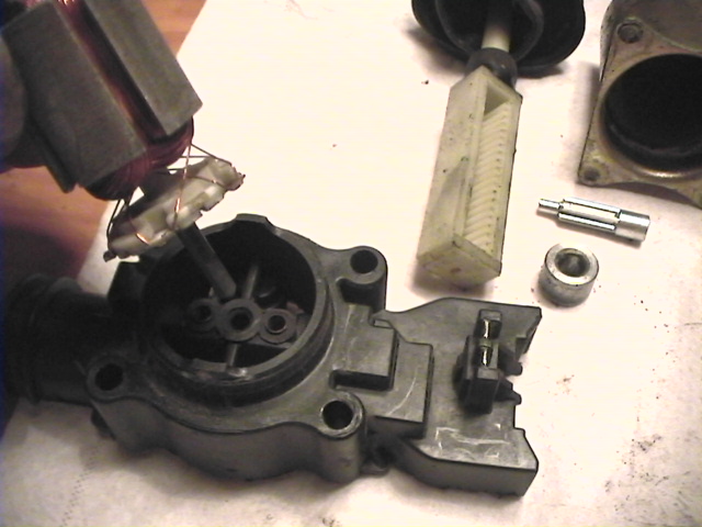 Once that is removed, you can remove the metal gear from the motor spindle. You can then see the metal strips that lead from the connector to the brush tubes, and a glass tube that houses a bi- metal strip that is an anti-overload mechanism.