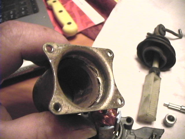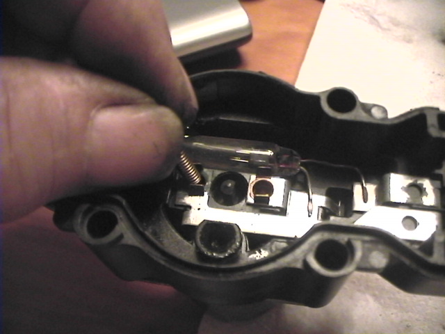 . Turn it all over, and drop the brushes into their tubes, and then the springs. Next you have to be very careful bending the retaining tabs back over the springs. Replace the black plastic plate, etc, and then bolt it all back together. Hopefully, it will work!!