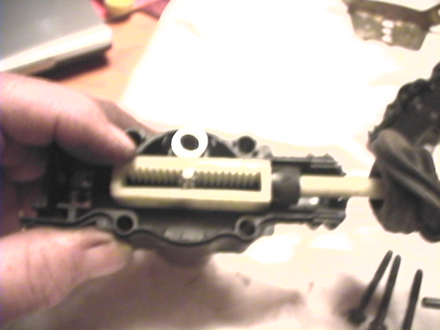 You can now remove the drive shaft with the nylon gear, and the bearing/guide that keeps the shaft in place against the motor drive gear.