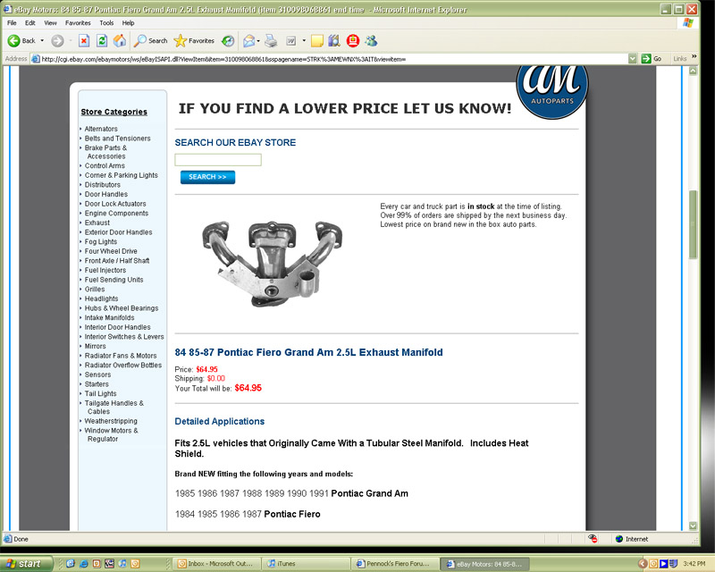 Well after a nasty gram they told me to ship the manifold back for a full refund. Minus what it cost to ship it back of course. So we shall see when my money gets returned. This is great a month later I might have a new manifold on my car. Thank you AM Autoparts. I told them they better fix their auctions and remove Fiero from the list of cars it fits on. I'm sure that will be ignored so don't ever buy anything from AM Auto parts via their website or via eBay.