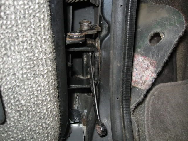 Next, remove the interior trim panel to access the single hinge bolt from the inside of the car.