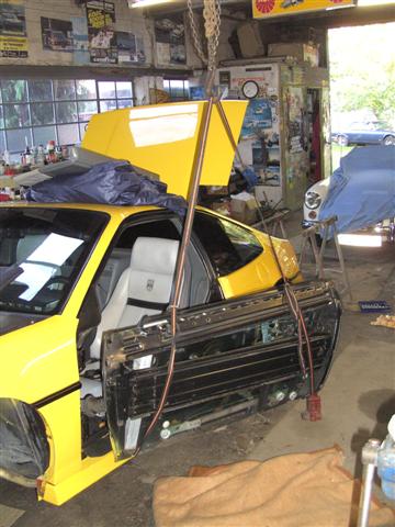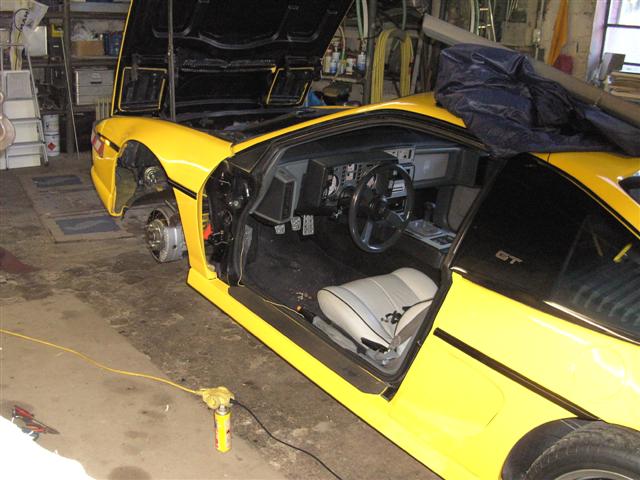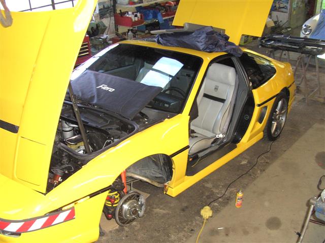 17" DEZENT T wheels with 215/40 tires front and 235/45 rear, KONI shocks, EIBACH lowering springs, drilled/slotted rotors, SS brake hoses. PU dog bone, all bushings and engine mounts, K&N air and oil filters, Rebuilt&blueprinted V6, BORLA exhaust. Mercedes SLK yellow paintjob, Mr. Mikes leather seats, door skins, shift and e-brake boots. MP3 deck and custom subwoofer behind passenger seat, F355 style front, Aus' Stage 2 side scoops, "Fie Ro" extractor front scoop. Fiero Store rear swaybar, strut tower brace, black carpet, air intake. Rodney Dickman's competition short shifter, SS vacuum lines and deck lid strut. Billet aluminum dash kit from Kitcarman.