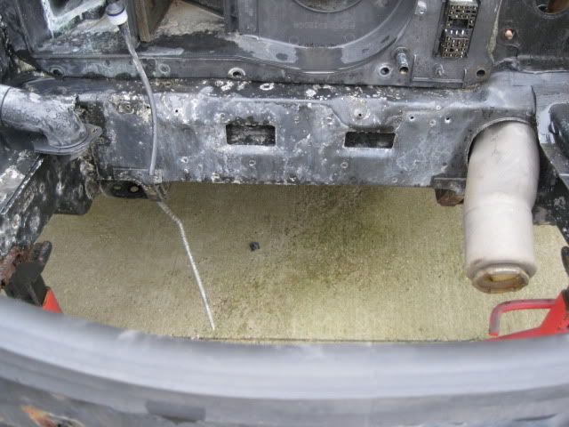 To make a front engine/rear drive setup, you will have to cut into this bukhead beam for either tranny or torque tube clearance and then weld/seal it all up: