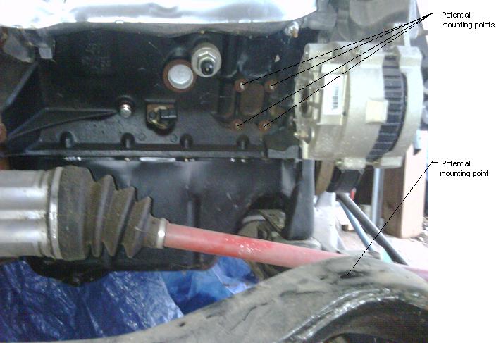 I'm thinking of making a bracket that would connect between the engine and the rear cross-member of the cradle (See the picture for mounting locations.) I'd, probably, use only 2 of the exisitng bolt holes on the engine and a urethane mount on the cradle. This bracket might be able to replace the conventional dogbone mounting locations on the top side of the engine. Also, the bracket could provide a mounting surface for an intermediate shaft. Any thoughts? Advise?