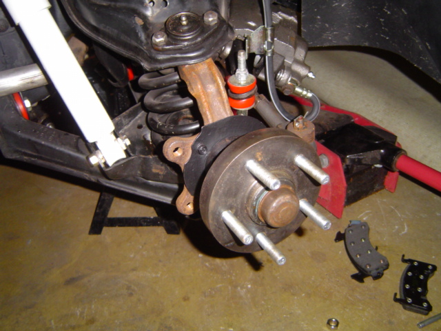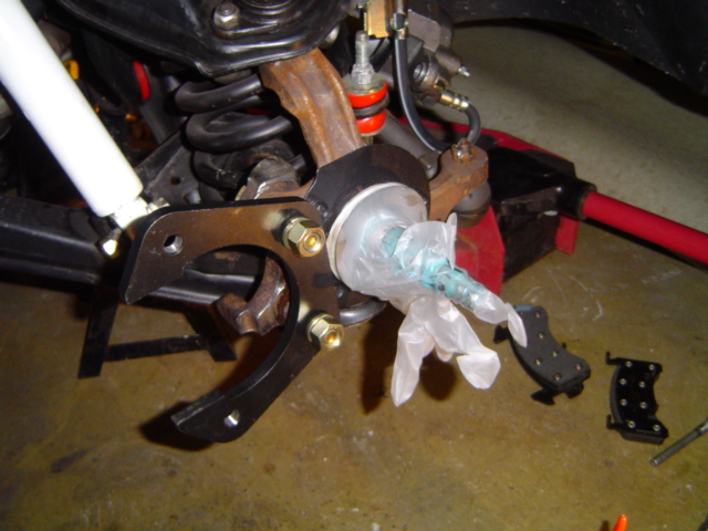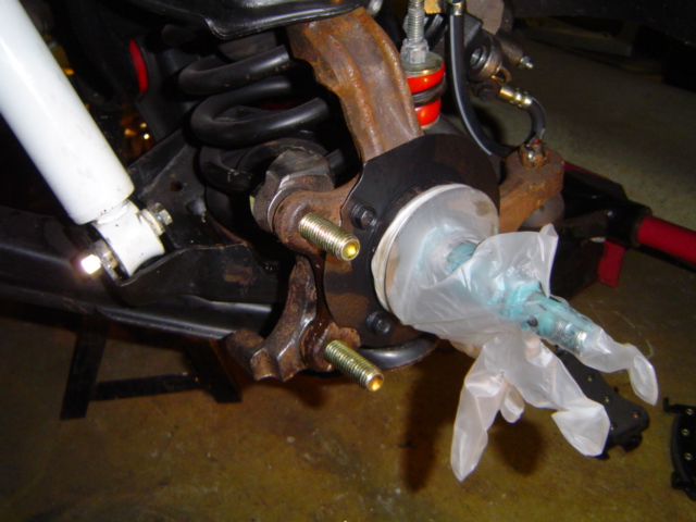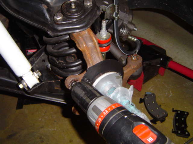I took my old caliper brackets and cut off the caliper mounting points. I also tried to find some long metric bolts and had no luck. To fix that problem I drilled out the threads on the spindles to the same size on the brackets and ran a standered grade 10 bolt through the 11.25 bracket, spindle, & old caliper bracket and put a lock washer and nut on the back side.