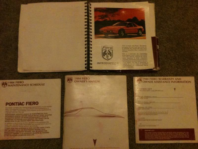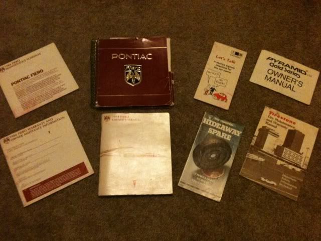 This is how a typical 1984 owner's manual packet looks like. Yes, for '84 it was actually a spiral bound packet. Everything fits into that maroon Fiero logo booklet. The booklet itself has pages showing the unique features of Fieros. I believe the Pyramid deck manual and Firestone tire packet is not what originally came with these, but everything else did. And I'm sad to say the back portion of the spiral booklet has separated with the passage of time.