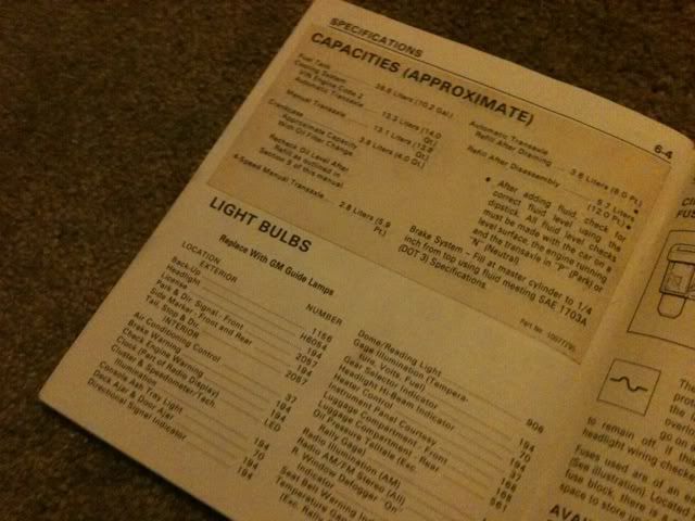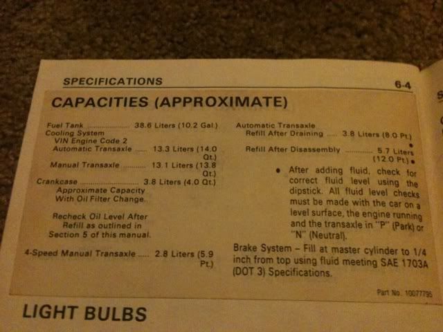 If you're lucky enough to have your original '84 owners manual, it was "updated" at the time of recall by whatever dealer you took the car in for to have the recalls done. The original owner of my '84 when I had it was nice enough to leave the owners' manual in the car. It's a rather interesting piece to have one of the "updated" '84 manuals. Essentially, the dealer would stick on new capacities over the old ones. You can hold my owner's manual up to a light and clearly read the inaccurate oil capacity as being 2.8 Liters (3.0 qt.). The new stickers placed in the manuals corrected the issues they had. I don't plan on getting rid of this manual set anytime soon as I think they're interesting pieces of Fiero history The "recall stickers" for the manuals strangely enough had part numbers 10077794 & 10077795.