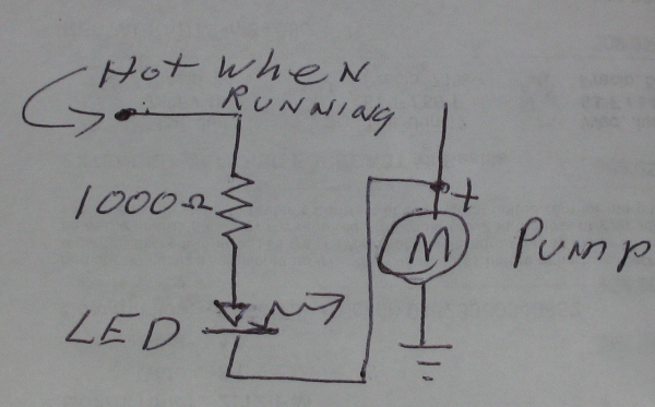 I use a relay to turn the pump on, but I do not turn it on manually. What I want is a wiring diagram that shows me how to put a light on the dash that tells me when the pump is not running - not if it's not pumping water. Please don't just tell me to "use a relay!" I don't know if you mean you think I should use the relay to manually turn on the pump and have a light somewhere on the dash come on or what. I guess I'm dense - I need more info. And yes it is a SBC. I wired it for auto ON so I don't forget to turn on the pump. Again, I just want a warning if power to the pump is lost not an indication of low or no water flow.