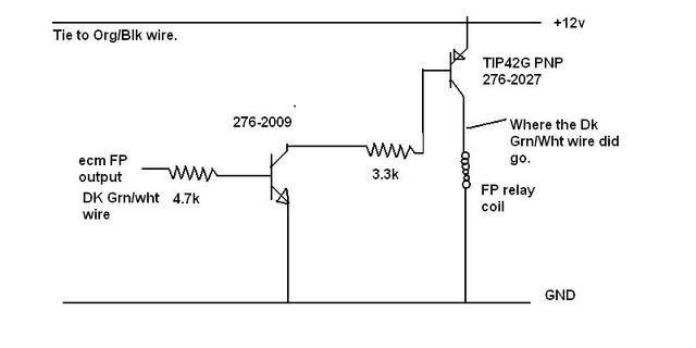 I changed out the clip and still no good. Checked the voltage on Dark Green and white wire with relay connected and 0 voltage. So like Dodgerunner said its either new ECM or his circuit. I want to attempt this circuit but I 1. Dont understand what im looking at with that picture and 2. I don't understand electronic lingo. Speaking to a laymen folks! I really would like to fix with a circuit before I have to go get an ECM! If anyone can help me out with this I would really appreciate it!