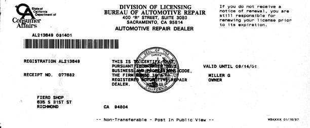 2) IS GEORGE EVER GOING TO GET A LICENSE (Fishing Licenses don't count) FROM THE CALIFORNIA BUREAU OF AUTOMOTIVE REPAIR TO CONDUCT A LEGAL BUSINESS AS AN AUTOMOTIVE REPAIR SHOP? AND WHEN? - Fiero Shop HAS a license from the Division of Licensing, Bureau of Automotive Repair (Registration #AL213649) as I have mentioned in my earlier posts.