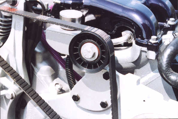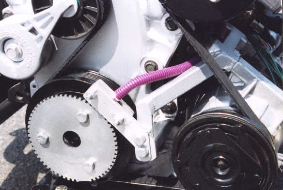 The crank trigger installed on the balancer. See the sensor mounted on a sturdy adjustable bracket that is attached to the A/C mount bracket I designed.