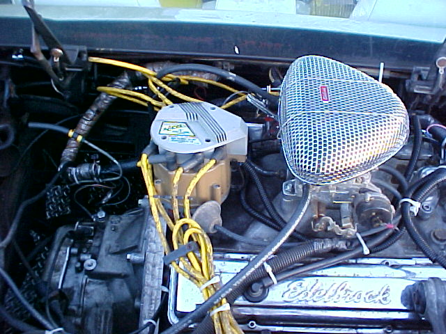 The engine is a mid-80's Corvette 4 bolt main with double-hump heads ported and polished to specs along with a mild cam, Accel distributer, CSI waterpump, totally rebuilt block, pistons and crank, high-rise dual plane intake with an Edelbrock 650 carb. blueprinted, balanced and dyno'd at 410 HP at the crank bolted on with an Archie kit. Auto tranny with a shift kit, and a line of spares to go along with it. Flowmaster 80 series exhaust keeps the headaches away while cruising.