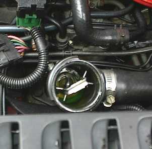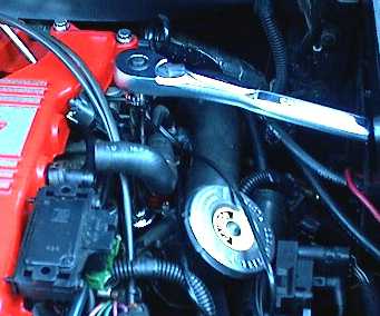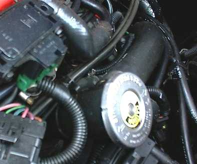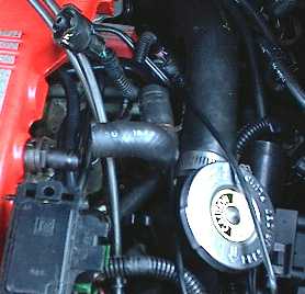 Here is a shot of the location of the thermostat to be changed and radiator temp switch (it can't be seen in the pic, but it is about 2 inches behind and then down about 3 inches from the thermostat cap), of course it is not easy to get at.