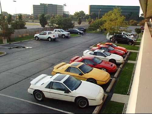How about a couple pre-fierorama pics; here's a couple shots at the hotel early in the morning while everyone else slept. From closest to farthest car is: Tigers hugger orange 84 SE, my 85 red V6 SE (yes it's actually clean ), Savagery's white 86 GT, Fieromaster88's red 88 coupe with built 3.2/5-speed, an 88 yellow formula from Indiana, and on the far end is Paul V's white formula with GT nose that's for sale.